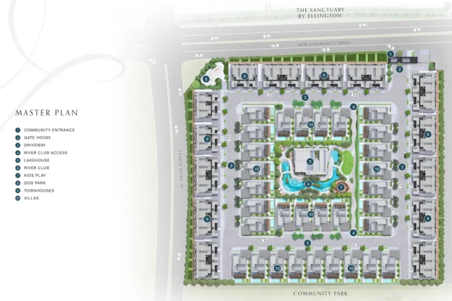 - The community is designed to offer a peaceful retreat lined with bespoke water features flowing through its center, enhancing the serene environment.